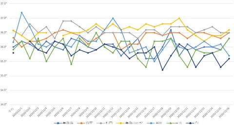 弊社では社員一同に理解いただき、普段からの検温記録を行っています。